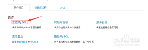 1. 在"服务管理"下点击"MySQL",进入"MySQL管理":(注意:如果app已经异常:停机等,需要先开启app,app状态正常,才会出现以下内容。)