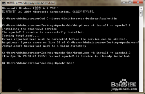 键入命令:httpd.exe -k install -n apache2.2,回车后,提示安装成功