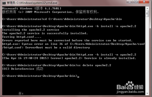 卸载服务,运行命令行程序,输入 sc delete apache2.2