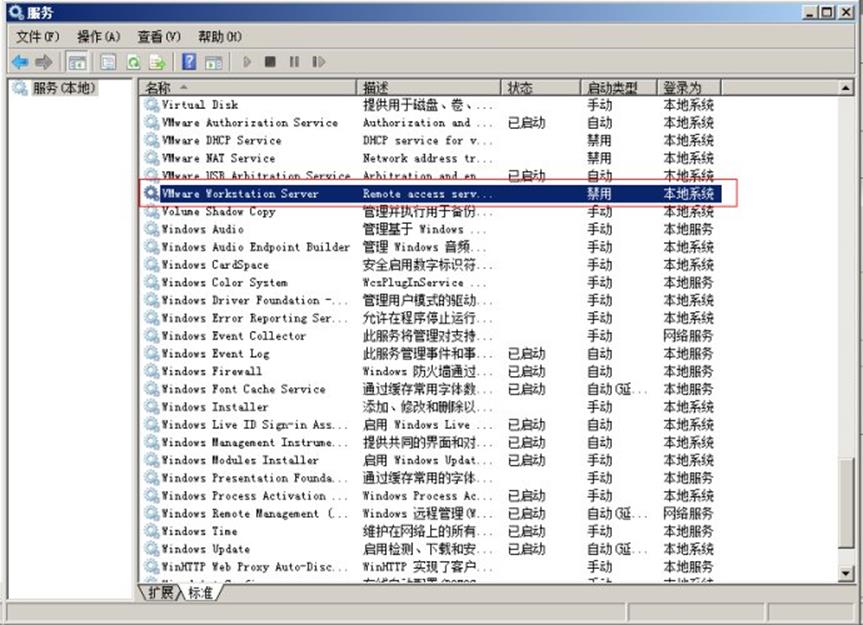 此时打开系统服务管理窗口,将VMWare Worksation Server这个服务停掉即可。禁用后的服务如下图: