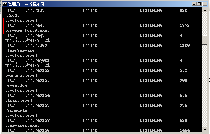 在窗口中输入 netstat -obna 之后回车,在列出来的信息遂个查看443端口和80端口是否被占用。在我的环境中发现VMware的一个服务占用了443端口,如下图所示: