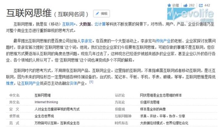 这句话其实没什么问题,说得也挺好的,但不知为什么后来就变成了一整套形而上的理论。看看百科对"互联网思维"的介绍,整一个邪教行动纲领似的,还有世界观、范式、认识论、方法论和价值观。我整个人都方了。在吹泡泡方面能与互联网思维相匹敌的,大概只有"工业4.0"了。