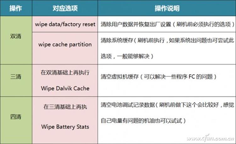 问题来了,在默认的情况下,手机预装的官方Recovery(恢复模式,关机时长按音量减和电源键所进入的界面)只会提供双清功能(名称各异,但大概意思就是恢复出厂设置)。如果你想进行三清或四清,就需要先刷入第三方Recovery后才能执行。