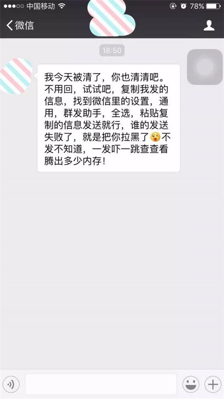 还有一些行为,比如动不动就发一些车祸、流血、脚肿、脓肿的图片,差点吓死个人;比如动不动一言不合就发自拍,下面还配上一些文字"今天某某地区发生8.0级地震,为灾区人民祈福",;比如发条信息过来说"今天是我男/女朋友生日,请大家给TA发一条信息祝TA生日快乐",超级无聊。