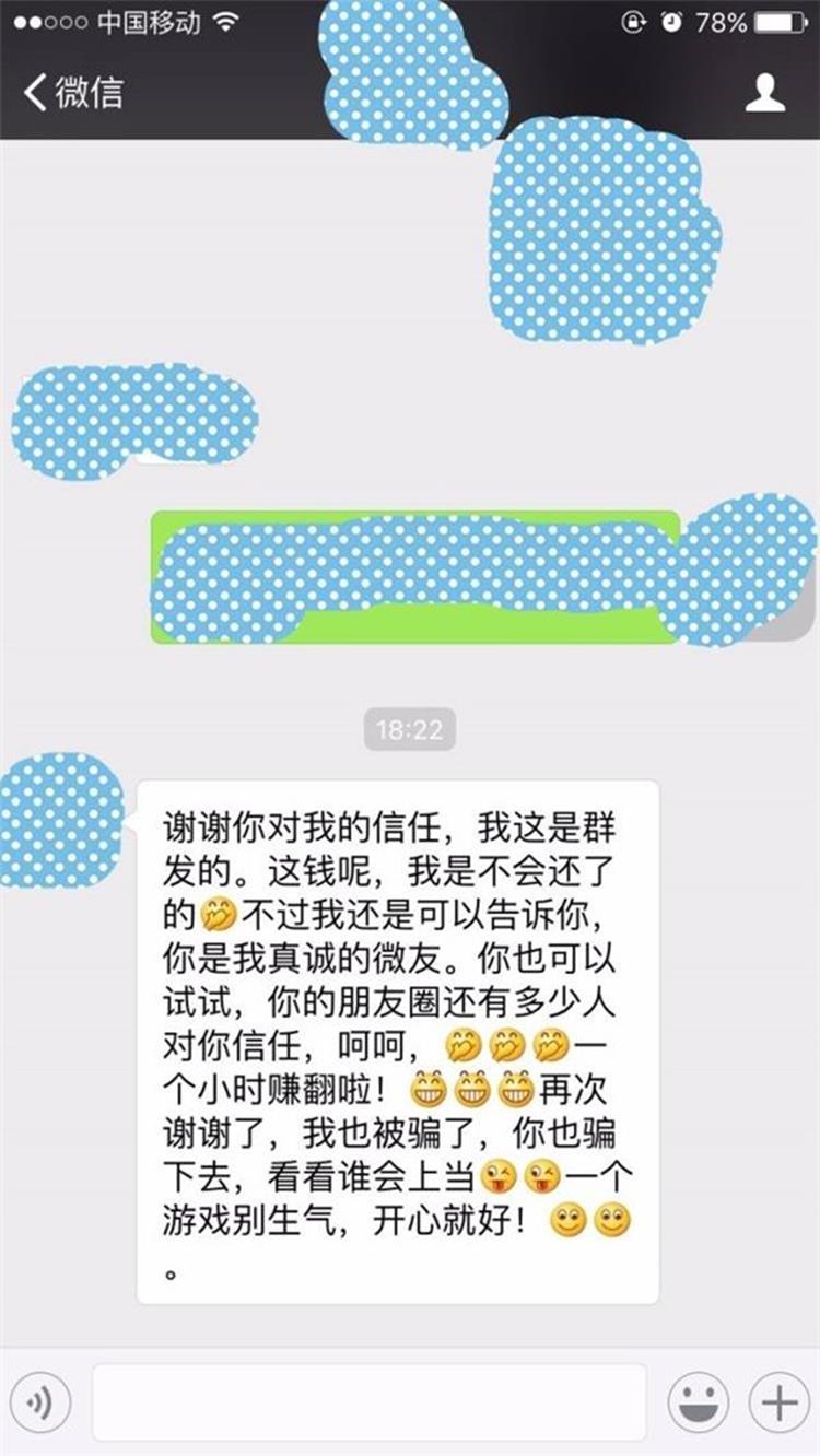 更甚至有些极品,他说最近看中了哪款包包,就缺那5块钱了,让你给他发个红包,不发不是真朋友。还有些是,借你五块钱,说是急用等下还。朋友嘛,五块钱大爷我还是借得起的,于是便借了。但过没多久后,就收到这样一条信息: