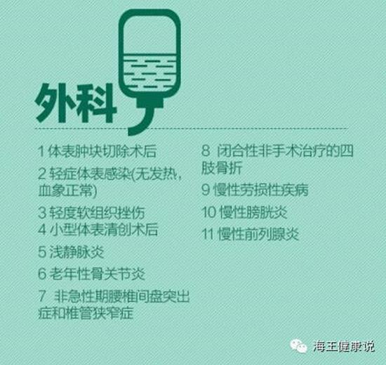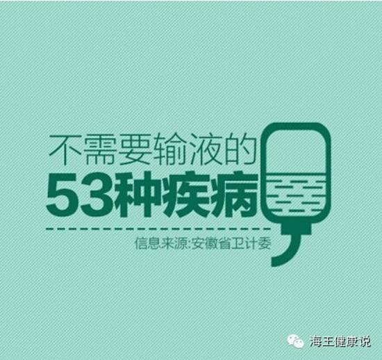 近日,气温骤降,感冒患者也随之增多,不少地方的医院出现扎堆输液情况。然而,此前的8月18日,安徽省卫计委下发了《关于加强医疗机构静脉输液管理的通知》,给静脉输液戴上了"紧箍咒"。《通知》确定了内科、妇科、儿科、外科中53种门、急诊不需要抗生素输液治疗的常见多发病,其中包括普通感冒、病毒性咽炎、小儿腹泻等常见病症。那么究竟包含哪53种疾病呢?