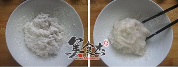 4.糯米面加入水和植物油,用微波炉转30秒钟取出搅拌一下