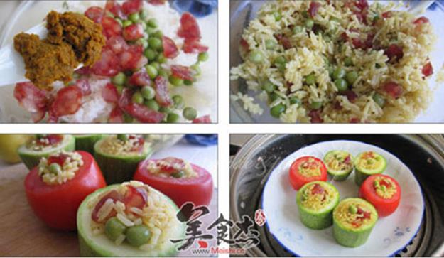腊肠2根、大米100克、荷兰豆30克、西红柿2个、紫甘蓝3片、色拉油1小匙、食盐1小匙、咖喱1大匙、沙拉酱1大匙