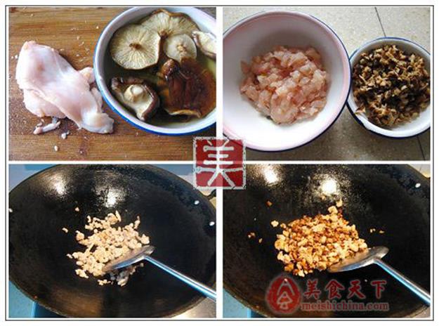 1、鸡肉切细粒后,先用生抽、一点砂糖、淀粉,拌匀备用;香菇泡发后切粒;