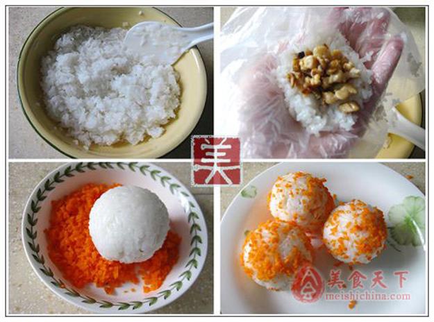 4、将饭团在胡萝卜碎上滚一圈,浑身沾满胡萝卜碎,完毕。