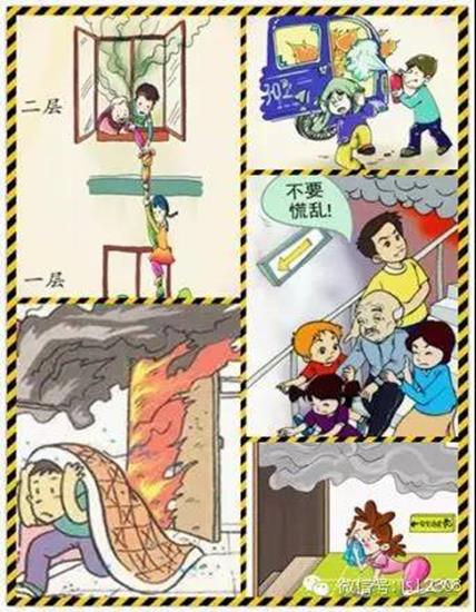 2. 高层建筑发生火灾,应用湿棉被等物作掩护快速向楼下有序撤离。应选择烟气不浓,大火未烧及的楼梯、应急疏散通道逃离火场。必要时结绳自救,或者巧用地形,利用建筑物上附设排水管、毗邻阳台、临近的楼梯等逃生。在无路可逃的情况下,到室外阳台、楼顶平台等待救援。不能乘电梯逃生。