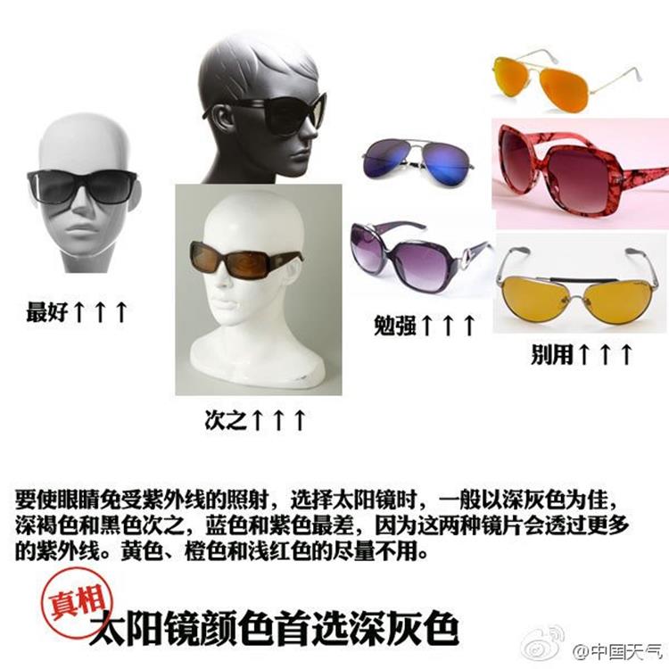 要使眼睛免受紫外线的照射,选择太阳镜时,一般以深灰色为佳,深褐色和黑色次之,蓝色和紫色最差,因为这两种镜片会透过更多的紫外线。黄色、橙色和浅红色的尽量不用。