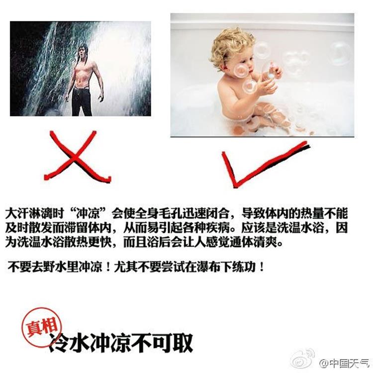 很多人认为用冷水"冲凉"能起到降温的作用。而事实上,大汗淋漓时"冲凉"会使全身毛孔迅速闭合,导致体内的热量不能及时散发而滞留体内,从而易引起各种疾病。