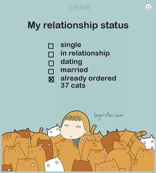 2、我的感情状态:单身× / 恋爱中× / 相亲中× / 已婚× / 已经收养了37只猫√