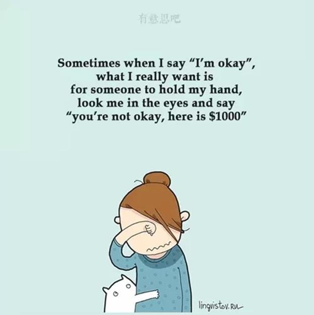 6、有时候我说"没事",并不是真的没事,其实我希望有人能紧紧握住我的手,凝视着我的眼睛,温柔地对我说:"不,我知道你难过,这里是一万块钱,拿去花!"