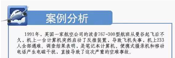 大量的证据表明,在飞机上使用移动电话等便携式电子设备会产生电磁干扰,造成飞机导航设备、自动驾驶仪器系统、特别是航空器无线电导航和通讯系统的正常使用,甚至导致机毁人亡的严重后果。