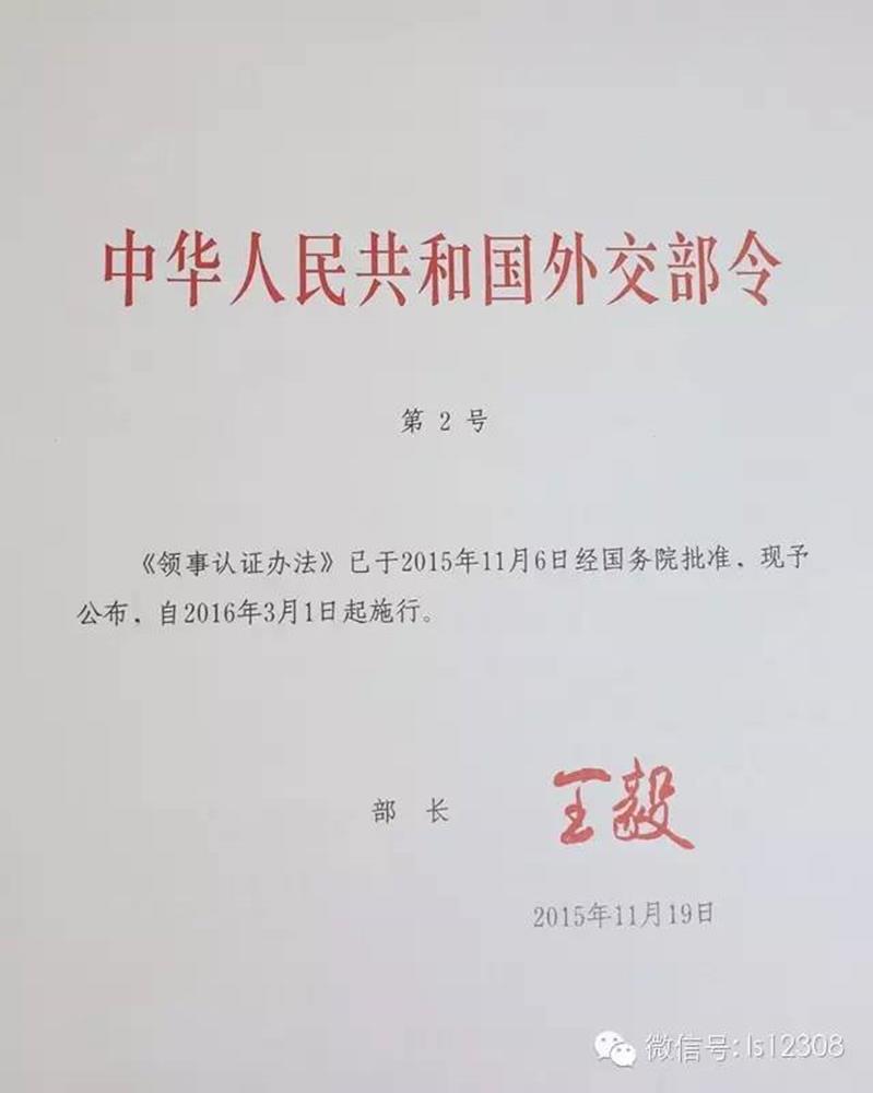 2015年11月,外交部部长王毅签署第2号外交部令,公布《领事认证办法》(以下简称《办法》)。