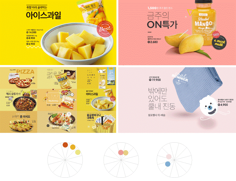 我们发现emart直接用互补色设计的案例并不多见,主要还是在补色分割范围内的应用变化,这样既能达到很好的视觉对比效果又能使画面融合度较高。这里挑选了几个补色系里面比较有代表性的搭配方式,整个画面视觉配色上相当活跃,主产品很突出,是一种很赞的传达方式。