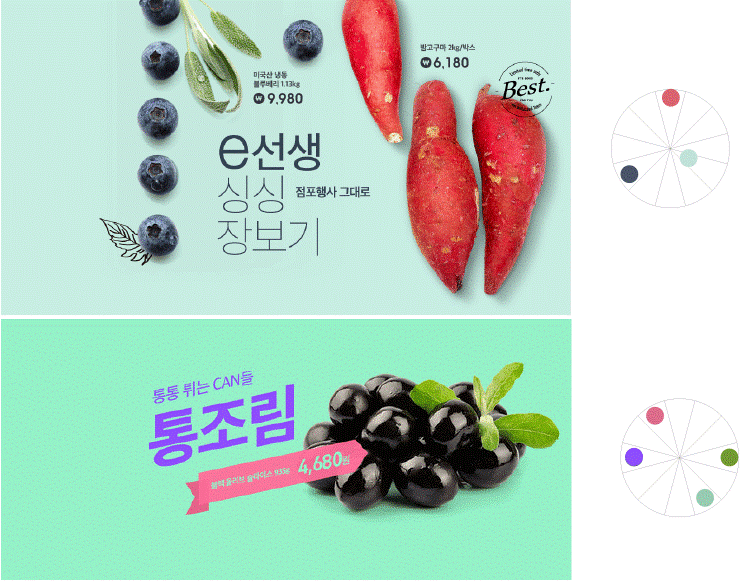 这里把互补色、单边补色分割、补色分割三种情况一同来说,因为三者在大范畴内上下浮动,效果也颇为相似,并无特别明显的区分。emart 在补色上的应用比较广泛和娴熟。主要还是因为整个网站调性很活泼,加之产品都属于色彩明快的快消品类,色彩上的愉悦感更容易激起点击欲望。