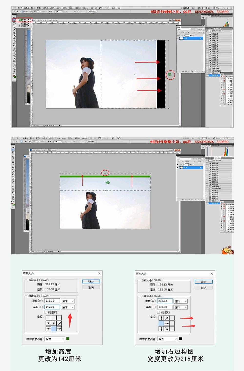 第二步:为了使天空的区域更广,更好的融合天空素材,需要改变照片构图,找到 【图像】中【画布大小】增加右边区域,设置宽度为218,使用【矩形选框】选择右边一块区域,【ctrl+t】自由变换往右边拉,改变右边构图之后,使用同样的方法改变高度大小,当然这个都是因人而异,以上数据仅供参考。
