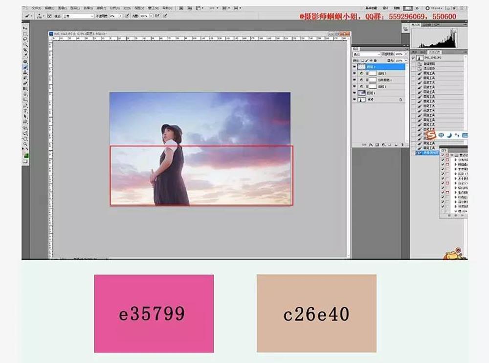 第八步:选取颜色,在选框内使用柔光画笔进行涂抹,让照片更有动漫夕阳的感觉,具体颜色可参考图上,涂抹根据个人喜好。