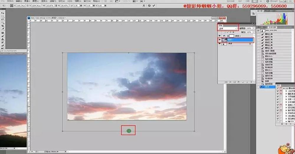 第三步:使用【移动工具】把天空素材拖到背景图层上,将会得到新的【图层1】天空素材,使用【ctlr+t】扩大天空素材,将天空素材调至合适位置,图层模式更改为【正片叠加】模式。