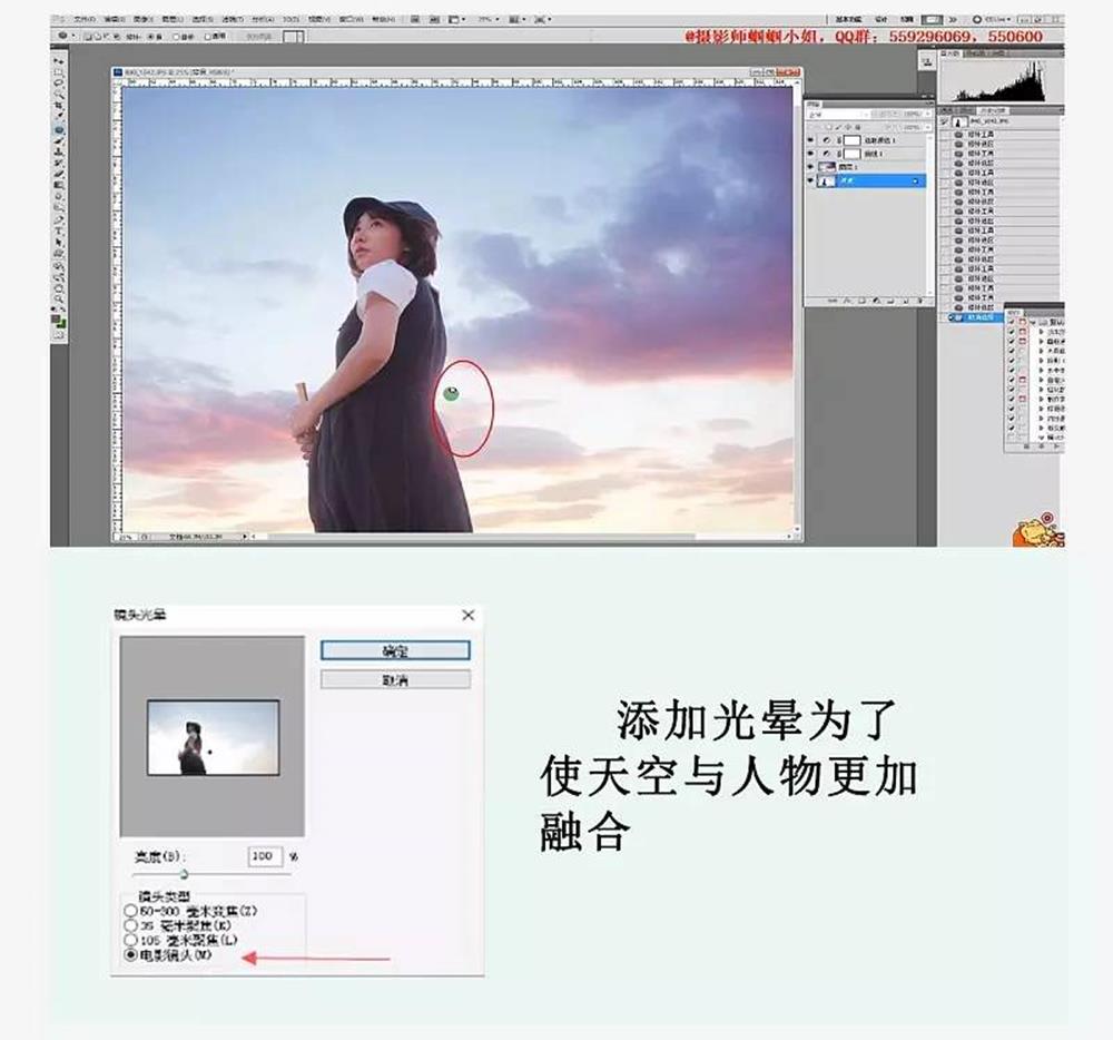 第六步:在【滤镜】找到【镜头光晕】选择【电影镜头】调整到合适的位置,提高整体氛围。