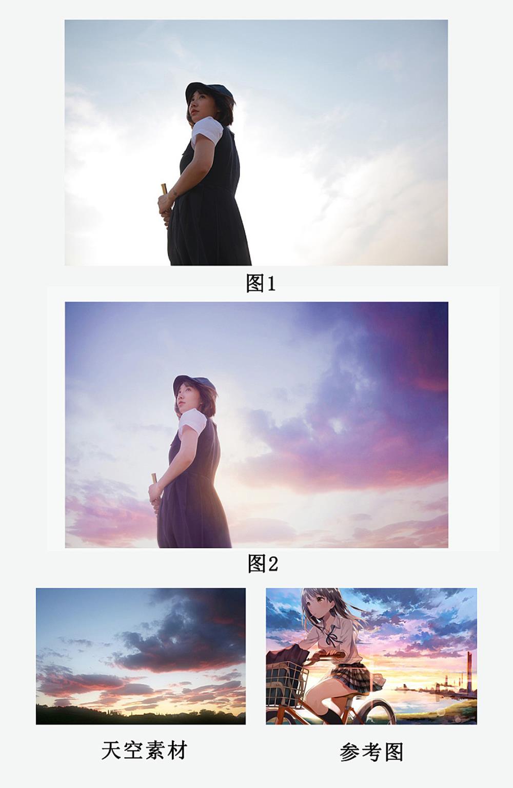 首先,作为摄影在拍摄前,我们要明白自己拍摄主题与目的,希望后期达到的效果,尤其是当我们需要后期叠加素材时,脑海中自然而然会有大致画面,就以"夏日"这组为例,原图(图1)希望能呈现一种唯美天空类似动漫感觉(参考图),很显然原片(图1)完全达不到标准,整张照片过暗,由于拍摄时间原因,天空过于平庸,那么我们就要想到通过后期叠加素材来达到效果,以下为修图过程