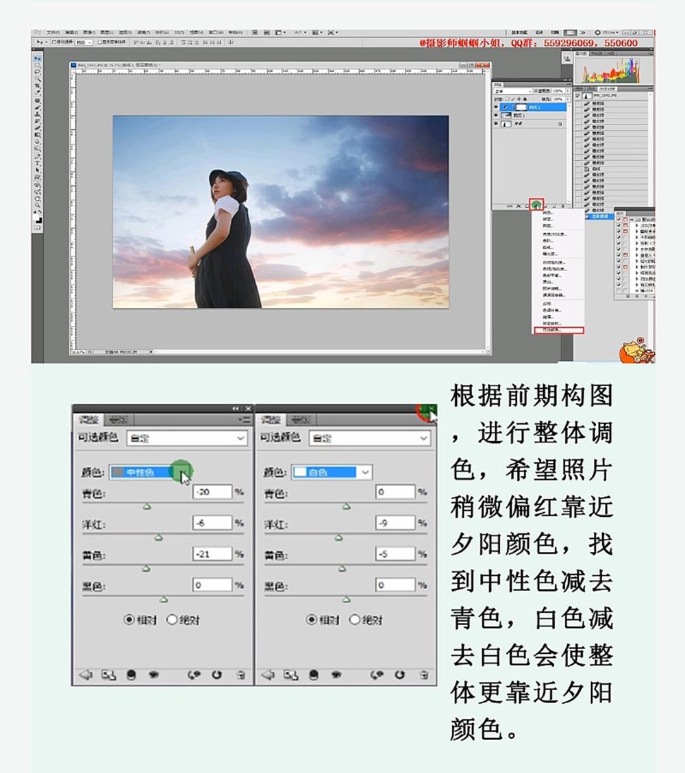 第五步:使用【可选颜色】,对照片进行整体调色,数值可参考图片。