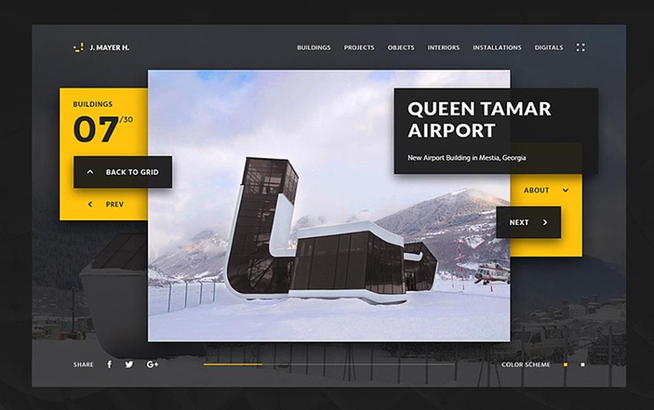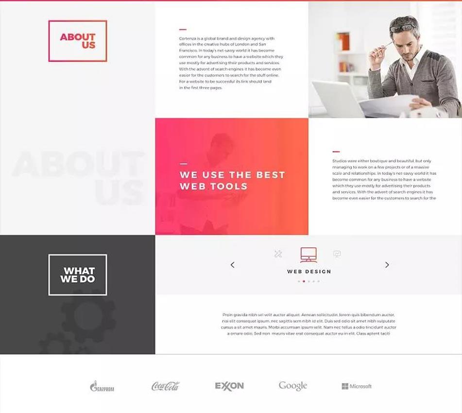 下面这个建筑公司的首页,采用了方形的元素进行大小层次感的相互结合起来