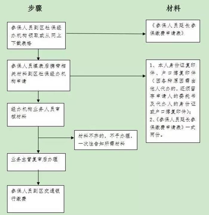 (二)参保人员按要求填报后,持本人身份证、户口簿原件及复印件,到社会保险费征缴科办理延长缴费手续;