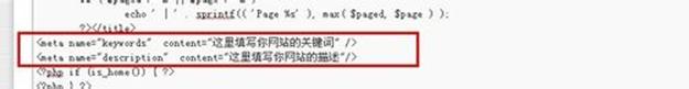 众所周知,wordpress官方下载安装的程序,默认是没有关键词和描述的,只能填写网站标题和副标题。但是作为我们seoer来说,关键词是用来实时关注网站关键词排名的,描述是可以提高关键词排名速度的,两者缺一不可,那我们如何增加关键词和描述呢?网上有很多插件,下载插件可以完成关键词和描述的填写,可是在这里wbchz不建议大家下载插件,因为wordpress如果安装插件太多的话,会导致网站运行过慢,导致空间压力增加,所以我们一般选择的是直接在头部文件(header.php)增加代码可实现wordpress完美增加关键词和描述: