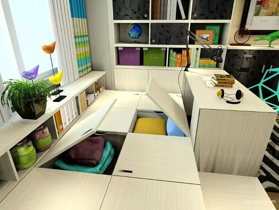 榻榻米床可以收纳一些过季的衣物、枕头等等,新婚必定会收到很多新毯子、棉被等礼物,做个榻榻米床可以为衣柜减压,收纳很多东西,还能剩下不少空间。