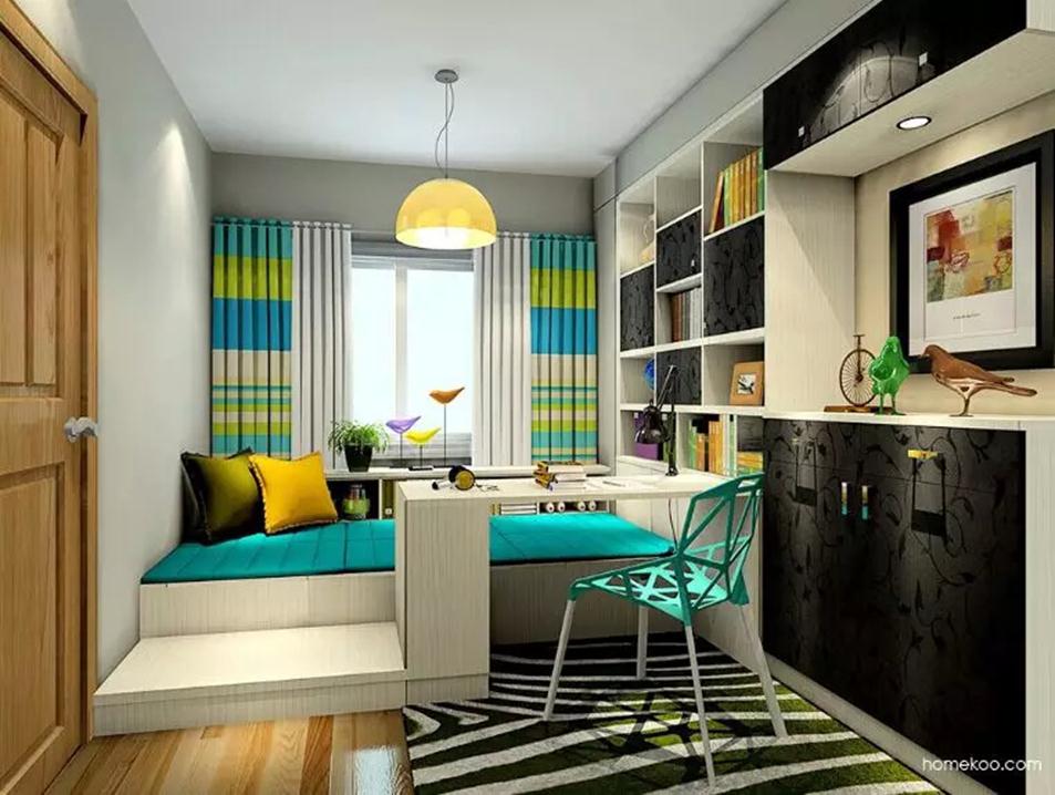 小户型家庭,将书房打造成一个多功能空间,是书房也是次卧,对方父母或亲戚朋友来了可以在这此留宿。