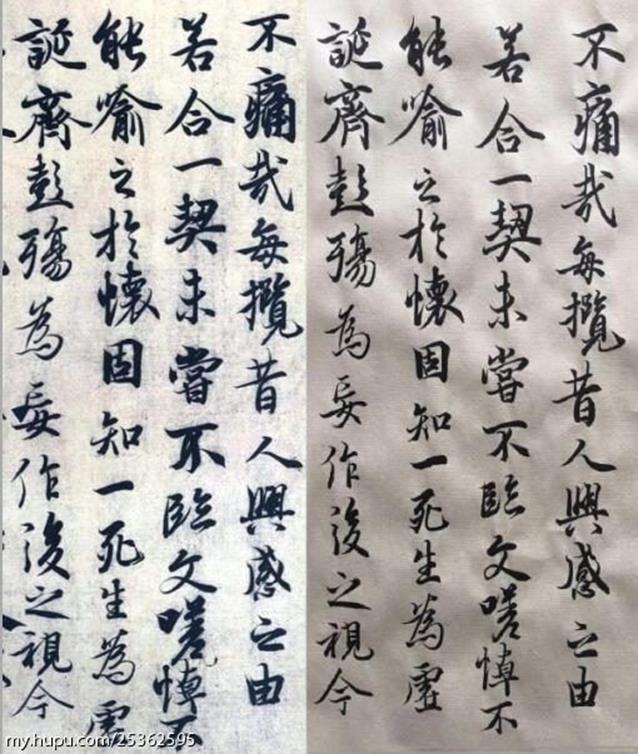 重点说一下临帖。摹,在古代更多其实是为了复制。比如我们现在见到的最出名的兰亭序的版本,就是唐朝一个宫廷高手,冯承素,摹下来的。摹其实也是很有讲究的,古代的叫双钩填墨。就是先用透光的纸勾出轮廓,再用笔顺着轮廓写。这个过程说起来容易,做起来非常难,要有相当的技法,以及书法功底才能弄出好摹本。至于临帖,很多人就栽在这上面,包括楼主。好的临帖,要做到"合掌",就是和打印机一样弄出完全一样的效果。这是极难的,但并非没有人做到。LZ的朋友写的兰亭序一部分,大家可以看看有多像,左边的是原本,右边是他临的。