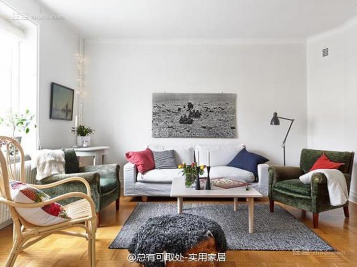 一个主沙发,多个单人椅、扶手沙发,没有电视的客厅,重心可以成为沙发区,你还可以在客厅的走道上摆单人椅,在没有朋友的时候,把它挪走不是难事。