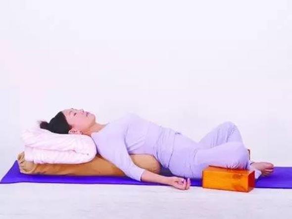 仰卧束角式有助打开胯部,缓解因久坐造成的坐骨神经不适。女性在痛经时练习这个体式,对腹痛有明显的改善。