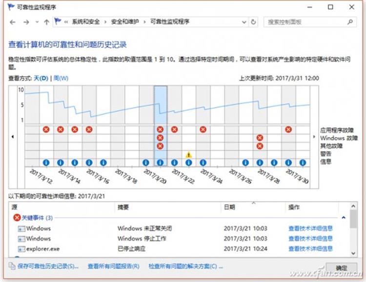 首先呢,先来和大家说下小编经常使用的Windows查错方法:进入"控制面板-系统和安全-安全和维护",点开"维护"的折叠项目,看到"查看可靠性历史记录"了吗?许多有关系统报错信息就存储在这里的哦!进去之后依次查看下红色的叉子。