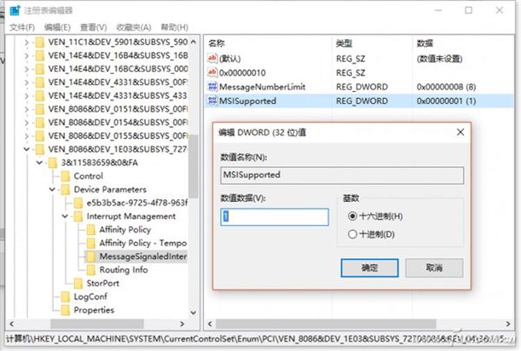 HKEY_LOCAL_MACHINE\System\CurrentControlSet\Enum\PCI\????\Device Parameters\Interrupt Management\MessageSignaledInterruptProperties"(????是刚刚记录的"设备实例路径")