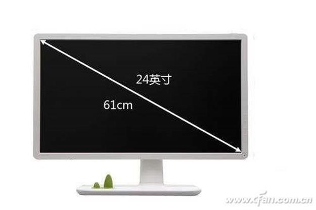 很多人以为显示器多少英寸是边长,实际上可不是那么回事,所有显示器都是对角线的长度,比如从左上角到右下角,16:9比例的显示器对角线长度是24英寸,大约是60.96厘米。另外注意,这是屏幕的尺寸,因为边框的宽窄不同,实际的边框尺寸也都不一样。可千万不要把边框长宽之一当作显示器尺寸来看待。