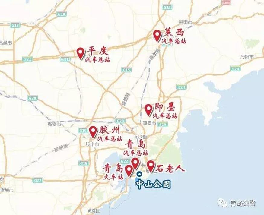 ●即墨汽车总站至青岛中山公园旅游直通车:周一至周五每日一班,即墨汽车总站发车时间为07:30,中山公园发车时间15:00;周六、周日每日发车两班,即墨汽车总站发车时间为07:30、08:00,中山公园发车时间为14:30、15:00。