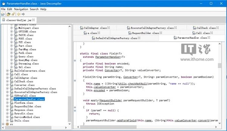 依次点击File-Open file,选择我们刚刚得到的classes-dex2jar.jar,打开它,你就能看到应用程序的JAVA源代码了。
