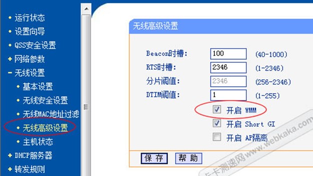 进入路由器管理后台后,点击"无线设置"-"无线高级设置",然后会看到界面有个"开启WMM"的选项,我们把那个勾去掉,就是关闭WMM了。