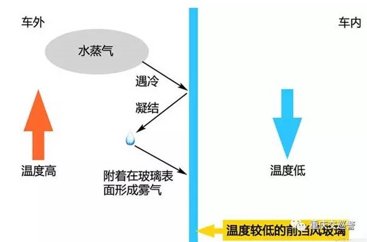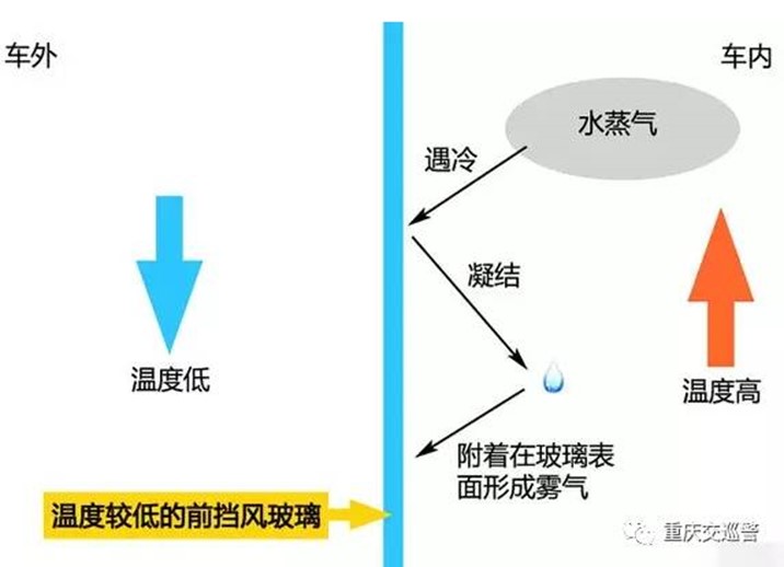 这时车外温度会比车内温度低,相应地,前挡风玻璃温度也就比车内温度要低,这使得车内的水蒸气在玻璃上遇冷凝结成的小水滴,附着在玻璃表面,造成车窗白茫茫一片的景象。
