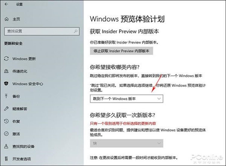 1、点击"设置"→"更新和安全"→"Windows预览体验计划",将"你希望接收哪类内容"一项设置为"跳到下一个Windows版本"。