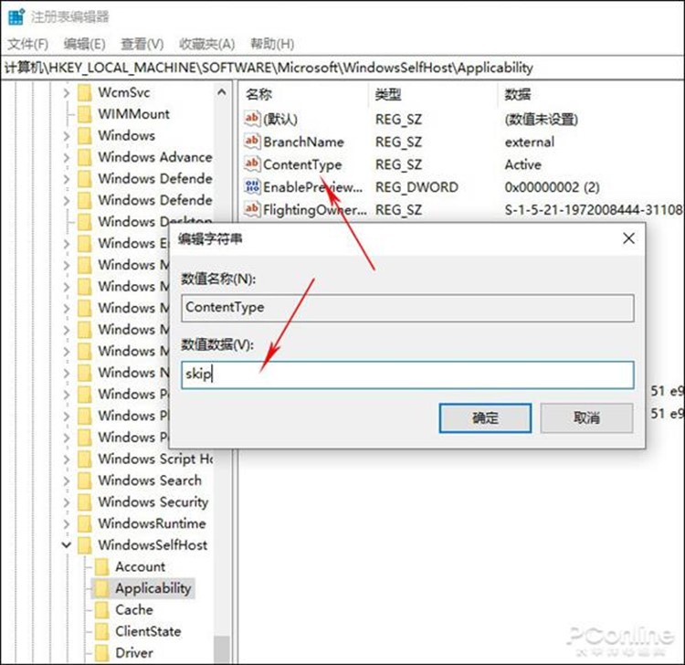 3、打开注册表编辑器,找到并展开"计算机HKEY_LOCAL_MACHINESOFTWAREMicrosoftWindowsSelfHostApplicability",双击右侧窗格中的"ContentType"一项,将默认键值由"Active"修改为"Skip",点击确定,关闭注册表编辑器;