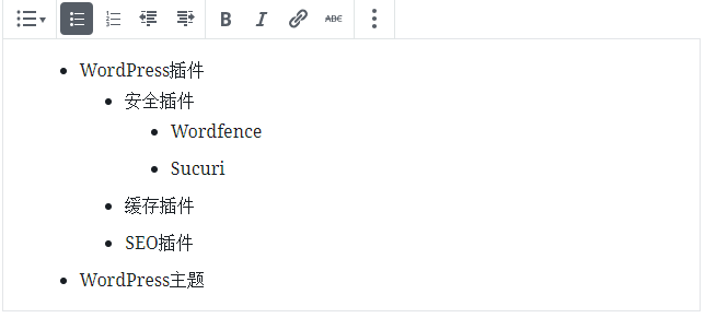 古腾堡的列表样式并没有改变,不过增加了一个非常重要的特性,列表缩进,这样我们就可以创建多个层次的分级列表