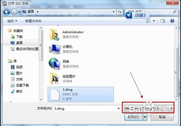 在"打开ISO文件"窗口单击打开右下角的下拉列表,选择"Mac(*.dmg;*.timg;*.hfs)"文件类型,然后浏览到dmg文件的位置,选中后单击"打开"按钮