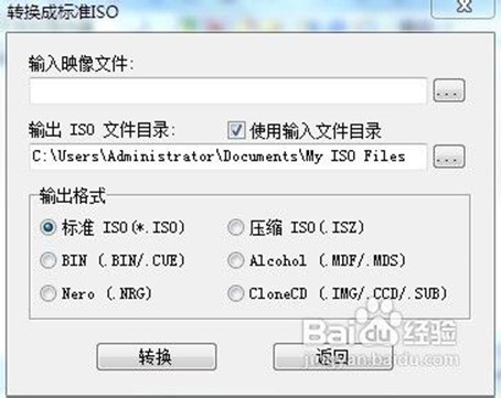 选择"输入映像文件"和"输出ISO文件目录",在"输入格式"栏下选择"标准 ISO(*.ISO)"选项,单击"转换"按钮