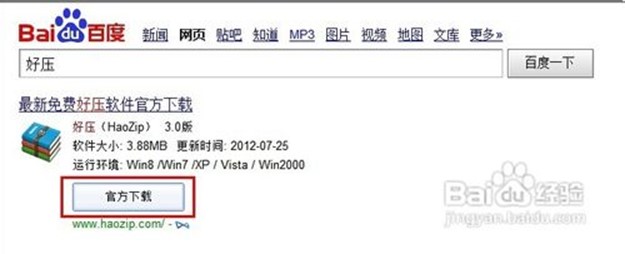 在百度搜索"好压"关键词,搜索出来的结果点击第一条链接下面的"官方下载"按钮